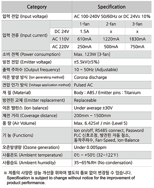 - Auto-Balance 회로 내장으로 핀의 오염 및 마모에도 제전 성능의 장기간 유지 가능