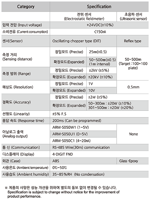 일체형 거리 보정 정전기 센서 ARM-S050 Series - 본 제품은 세계 최초로 초음파 센서와 전위 센서를 일체화 하여 초음파 센서가 대상과 거리를 읽고 내부 회로에서 거리에 따라 전위 센서가 읽은 전위 값을 자동 보정하여 측정값을 보여주는 거리보정형 정전기 센서 입니다.